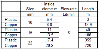 One 40m length of this plastic pipe would give us a flow rate of around 8litres/minute (About 2.1 US gallons/min or 1.75 UK gal/min.). This is a typical bath-tap flow rate.