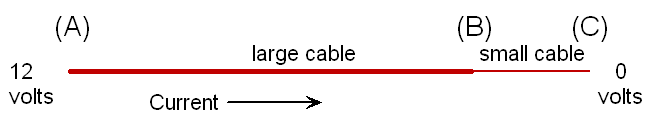 It is the LENGTH here that is the issue. If (A) and (B) are close, that section could be thin, but if the cable is long, it need to be fat. If the cable is very long, it needs to be very fat. However, making the short ends any fatter will make very little difference to the total volt drop.