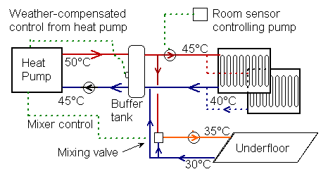 In the case of air, we need to ‘blow’ it at a reasonably warm temperature.. like 30°C. Air heat-exchangers are not as good as water ones, so we are likely to see refrigerant temperatures between 40 and 50°C. All in all, the condensing temperatures of the two types is likely to be similar, but underfloor systems could have a considerable advantage.