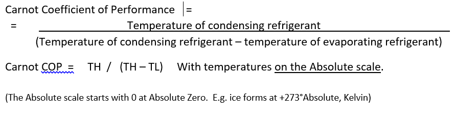 Simply measuring temperatures alone to estimate evaporating and condensing refrigerant temperatures (TH & TL), and then using the Carnot equation, we find surprisingly good correlation with measured COP in practice. We observe the measured COP to be between 45 and 55% of the theoretical Carnot COP, and for any specific system, variations in operating temperatures correlate with Carnot COP very well.