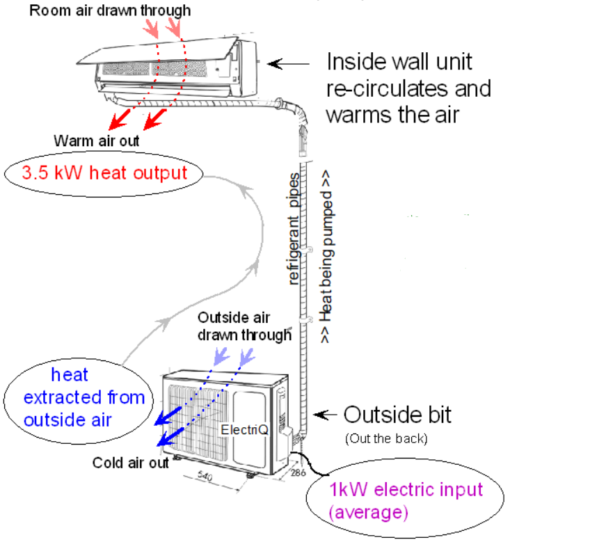 Air-to-air heat pumps have a fairly comparable COP to the common air-water type. However, the COP varies considerably over its high/low range. Dont just read a COP rating without knowing what outside temperature and compressor speed it refers to. Cheaper units are likely to be a worse, especially at times when defrosting is needed. Budget units like this seem to be let down by poor control, and the quality and efficiency will vary greatly. It also seems that some are not really optimised well for heating. However, their fast response and simple configuration could give them the edge for some applications. Air movement could lead to discomfort for some, though a slightly higher room temperature may counter this. A good positioning of the indoor ‘blower’ is vital…. You probably don’t want to sit under it. Though this summary might sound a bit negaitive, there are many situations where air-air can be an ideal choice if ‘driven’ well, and no doubt products are improving in the right direction.