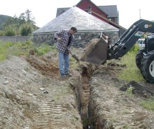 The picture shows one of several horizontal trenches being back-filled after the pipes have been laid.